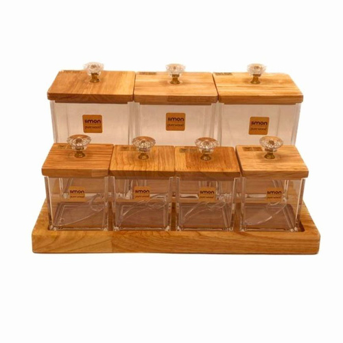 ست بانکه و ادویه از اکرولیک کفه دار درب چوبی تولید شده است.این محصول را برای شستشو داخل ماشین ظرفشویی قرار ندهید،بهتر است با آب ولرم و با اسفنج شستشو دهید و با دستمال خشک کنید و زیر نور مستقیم قرار ندهید.